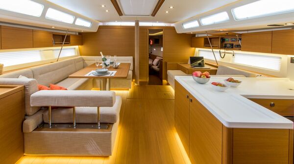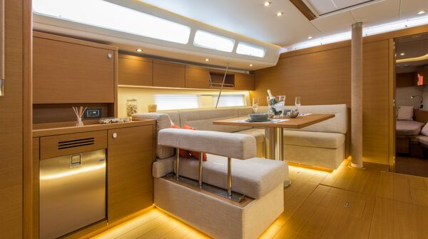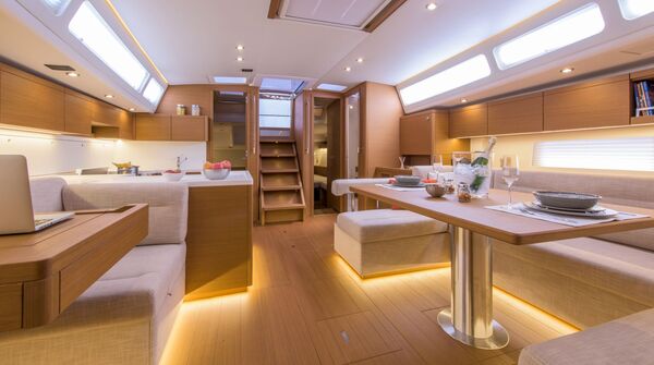 Massiver Salontisch mit U-Sitzgruppe an Backbord (Schublade unter dem achteren Sitz), zwei einzelne Sessel mit Tisch dazwischen an Steuerbord (der Tisch fungiert zugleich als Kartentisch). Der Salon der Grand Soleil 52 LC bietet reichlich Stauraum in Hängeschränken, Ablagen Schubladen und Regalen sowie in Staufächern unter den Sitzen. Breite, sichere Niedergangstreppe die sich mit Hilfe von Gasdruckfedern hochklappen läßt und den Zugang zum Motorraum freimacht. Handläufe in Decke und am Niedergang. -