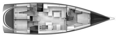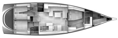 Die Grand Soleil 52 LC wird in einem 3 Kabinen-Layout mit Eignerkabine und en Suite-Eignerbad im Vorschiff, zwei Achterkabinen und Gästebad an Steuerbord achtern angeboten. -