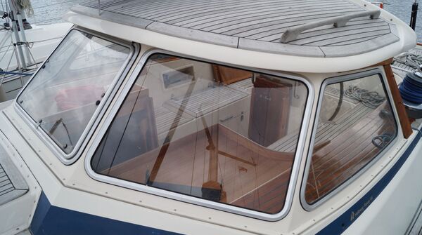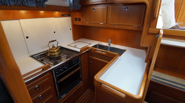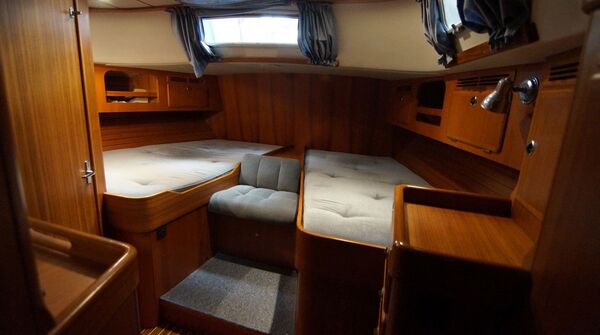 2 Kabinen-Layout mit Koje und Schränken im Durchgang zur Vorschiffskabine und optionaler Ausbau in Burma-Teak. Tiefkiel-Version (Tiefgang: ca. 2,30 m), Bugstrahlruder, elektrische Genauwinschen und VOLVO PENTA TAMD31S (100 PS/74 KW). Liegeplatz: Kieler Förde.