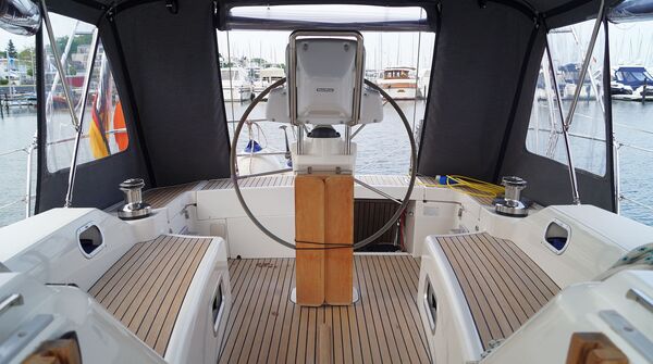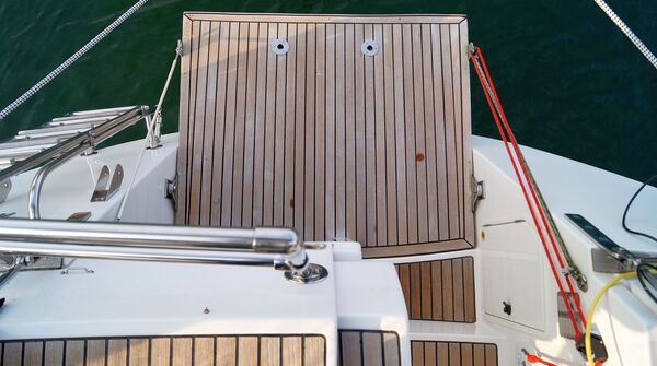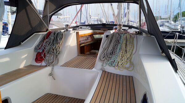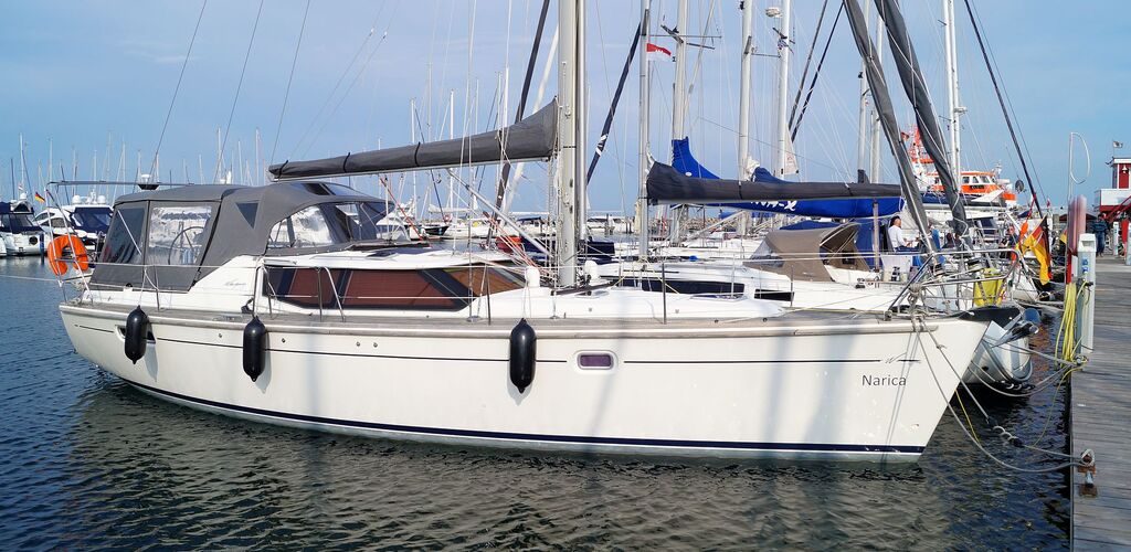 Auszug aus der Spezifikation: VOLVO PENTA D2-55 55 PS/40 KW Diesel mit Welle, zweites Vorstag mit Selbstwendefock, Teakdeck, große, ausklappbare Badeplattform, Bugstrahlruder (neu 2015), komplette RAYMARINE Navigation inkl. Radar. Liegeplatz: Deutsche Ostseeküste.