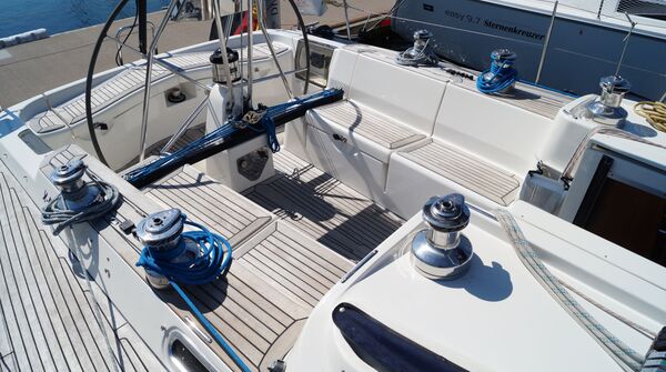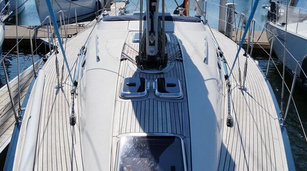 Auszug aus der Spezifikation: Tiefgang: ca. 2,20 m, ausfahrbares MAXPOWER Bugstrahlruder, größere Maschine: VOLVO PENTA D2-55 (55 PS/40 KW), Teakdeck überall, elektrische ANDERSEN Primärwinschen, RAYMARINE Navigation mit 2 x Kartenplotter, UKW-Sprechfunk und Radar, komplette NORTH-Sails Garderobe. Liegeplatz: Baltic Bay-Marina in Laboe.