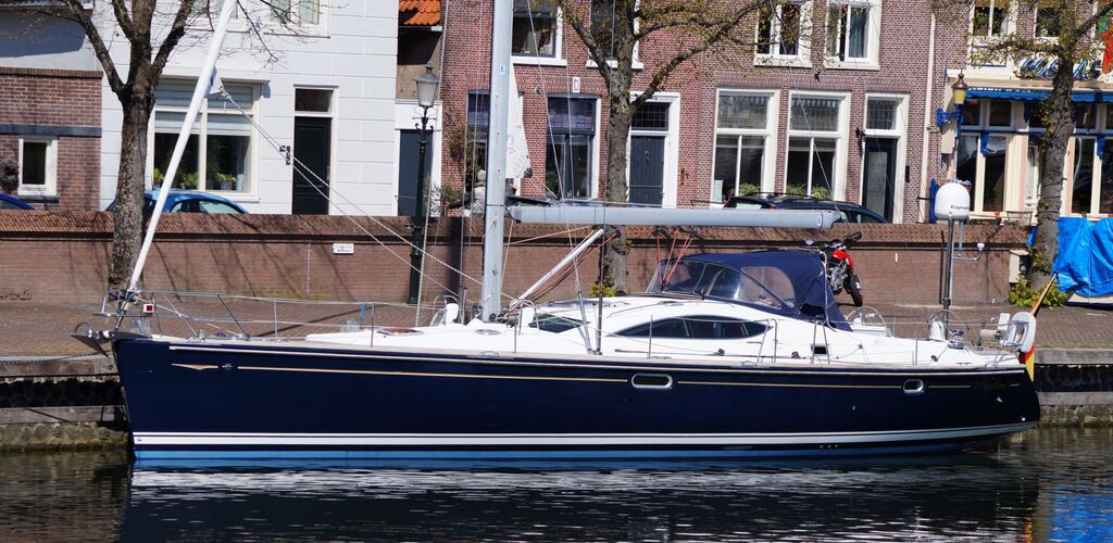 Elegante Linie mit dunkelblauem Rumpf, goldener Sieke und weißem Wasserpaß. Vollständige Spezifikation inkl. Rollmast, Bugstrahlruder, Satelliten-TV-Antenne auf Edelstahlmast am Heck, Wrede-Rumpflackierung, vollständige RAYMARINE-Navigation, zwei Mal Edelstahl Ankergeschirr, Dinghy mit Außenborder usw. Kein Mittelmeerschiff und keine Charter. Liegeplatz: Ijsselmeer/Niederlande.