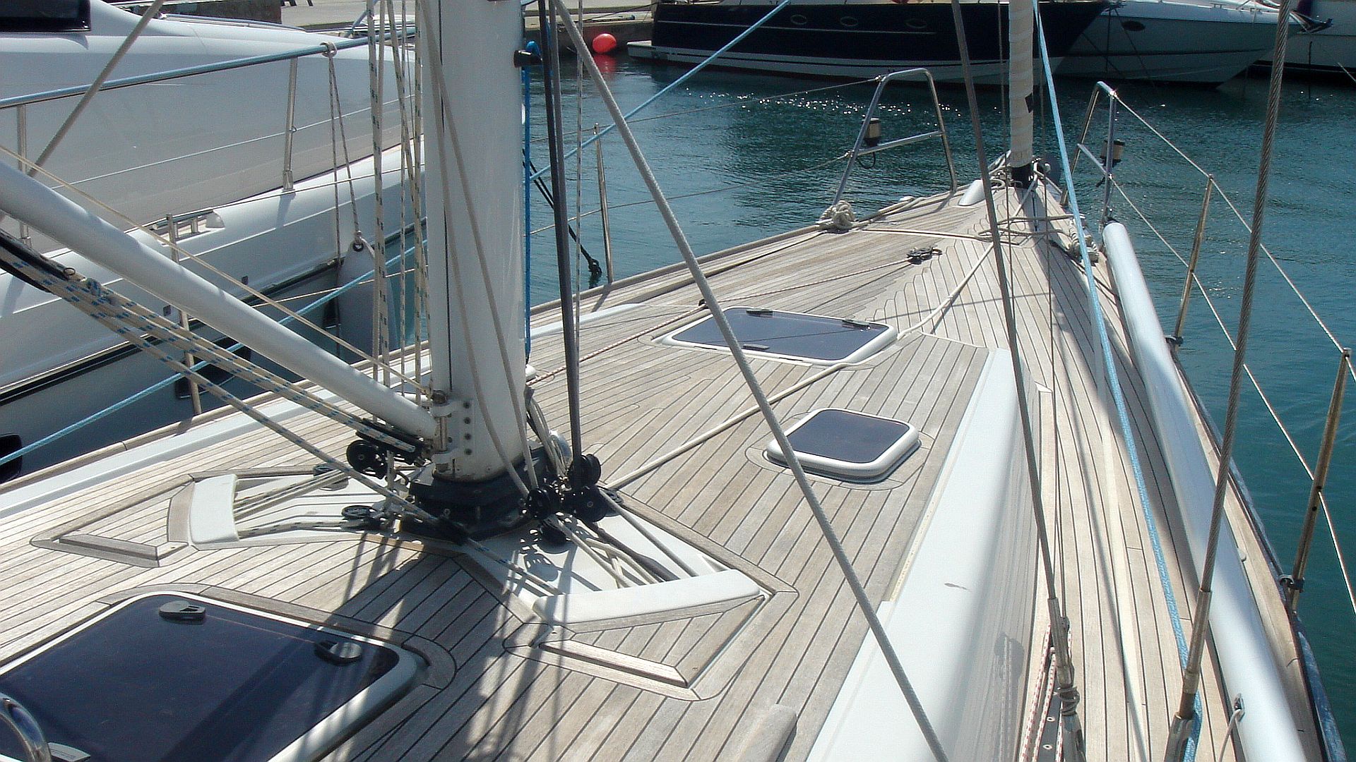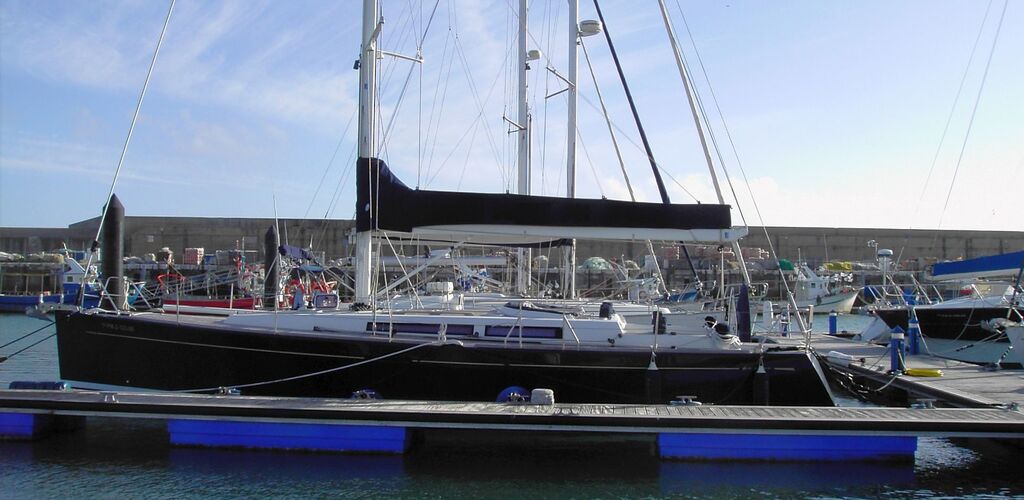 Auszug aus der Spezifikation: Blauer Rumpf, Teakdeck überall, Dieselgenerator, Teak-Interieur, Rod-Rigg, HARKEN Racing-Deckgear, VOLVO PENTA D2-55. Liegeplatz: Spanien.