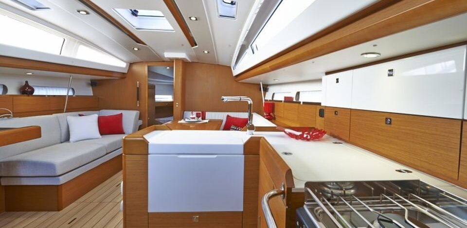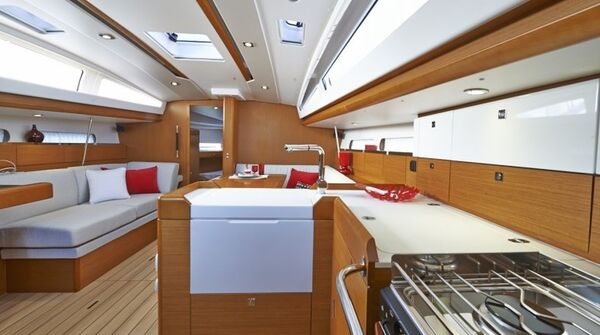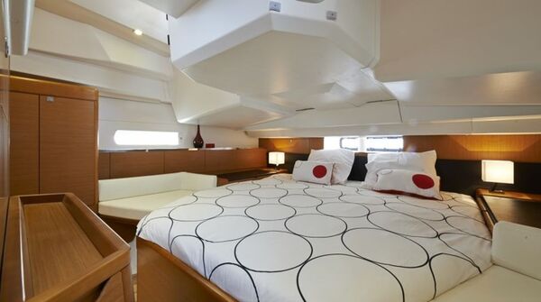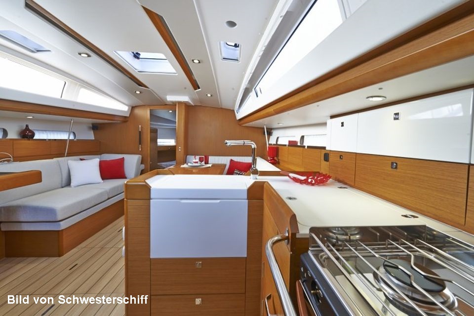 2 Kabinen-Layout mit luxuriöser Eignerkabine im Heck über die volle Breite des Schiffes und freistehendem "queensize" Inselbett. Kurzkiel-Version mit ca. 1,55 m Tiefgang. Einfaches Handling Dank Rollmast, Selbstwendefock, elektrischer Fallwinsch und Bugstrahlruder.